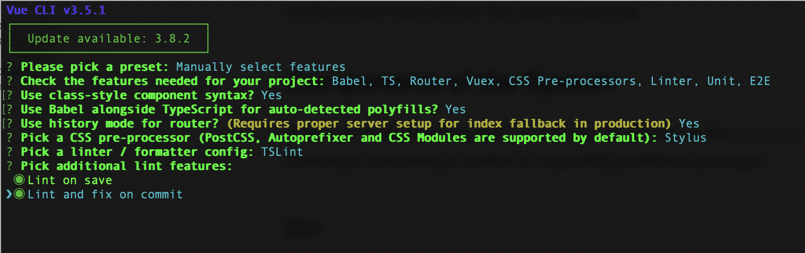 Next you will be asked about linters options. Use both (Lint on save and Lint and fix on commit)